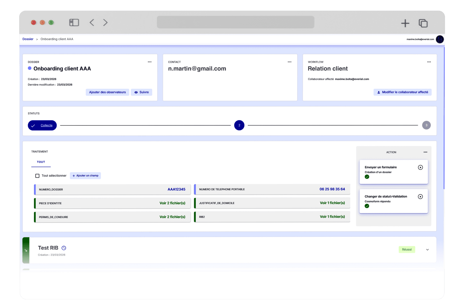 Les dossiers avancent automatiquement, sans dépendre de relances humaines. Les délais de traitement sont réduits et la complétude est suivie en temps réel. Chaque étape est tracée, contrôlée et optimisée.